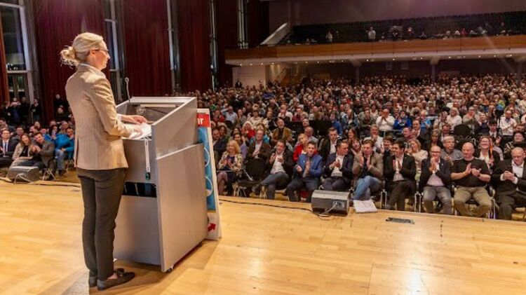 Вайдель также сорвала овации после фразы "Когда мы будем у руля, мы снесём все ветряки", подразумевая альтернативные электростанции.