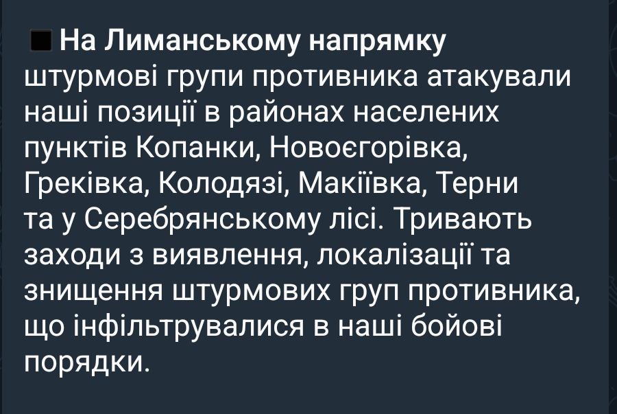"На Лиманском направлении противник пытается прорываться в н.п. Колодези, зафиксирован огневой контакт с противником на дистанции около 1 км до населенного пункта" - уточняет офицер с позывным "Алекс".