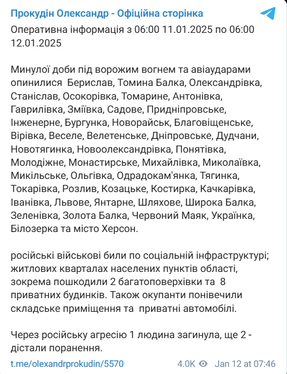 08:00 В Херсонской области из-за обстрелов РФ 1 человек погиб, еще 2 - получили ранения. Об этом сооющает глава ОВА Александр Прокудин.