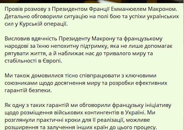 «Мы обсудили французскую инициативу по размещению военных контингентов в Украине. Мы рассмотрели практические шаги по ее реализации, возможное расширение и вовлечение других стран в этот процесс», – рассказал Зеленский.