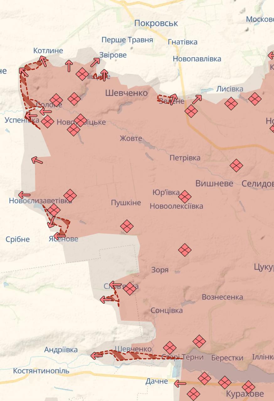 Под Покровском снова продвинулись на юге, на запад в направлении Удачного, севернее в направлении Котлиного (дорога между этими сёлами уже перерезана) и восточнее около Воздвиженки в направлении трассы на Константиновку.