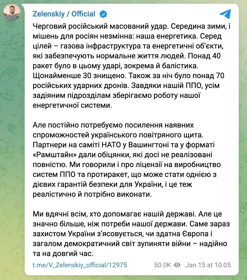 "Середина зимы и мишень для россиян неизменна: наша энергетика. Среди целей – газовая инфраструктура и энергетические объекты", - говорится в сообщении.