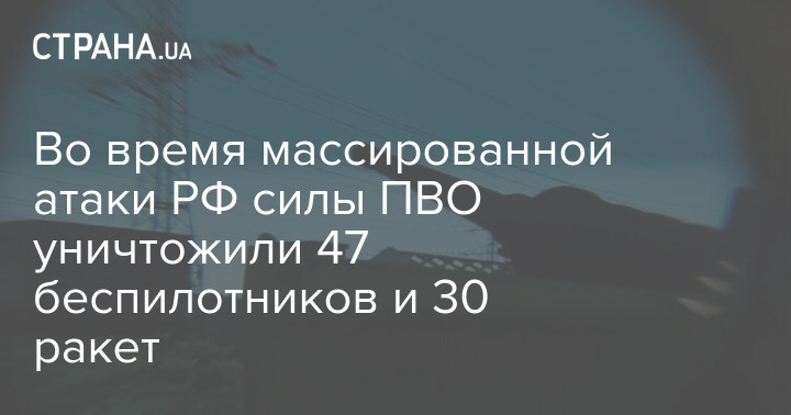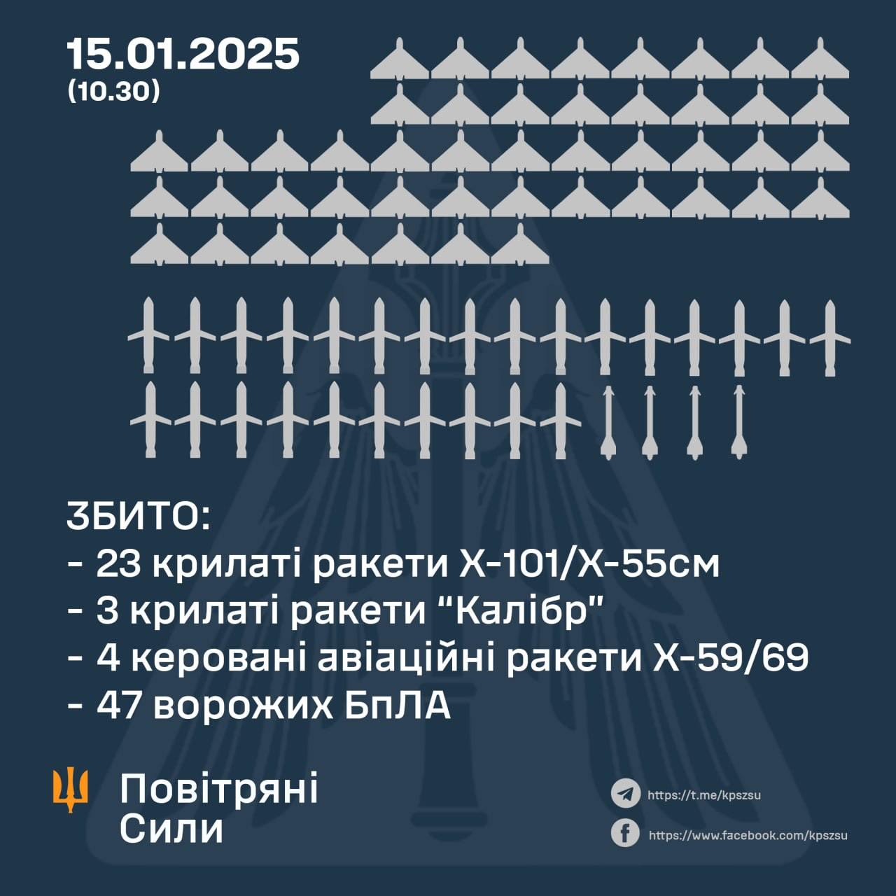 Сегодня утром во время массированной атаки РФ силы ПВО сбили 30 ракет из 43 и 47 "Шахедов" из 74. Еще 27 дронов "не достигли своих целей(локационно потеряны)".