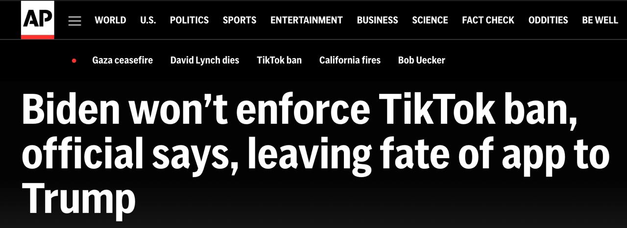 В прошлом году Конгресс в законе, подписанном Байденом, потребовал, чтобы материнская компания TikTok в Китае ByteDance продала компанию до 19 января - за день до инаугурации президента. Уходящая администрация оставит реализацию этого закона республиканцам.