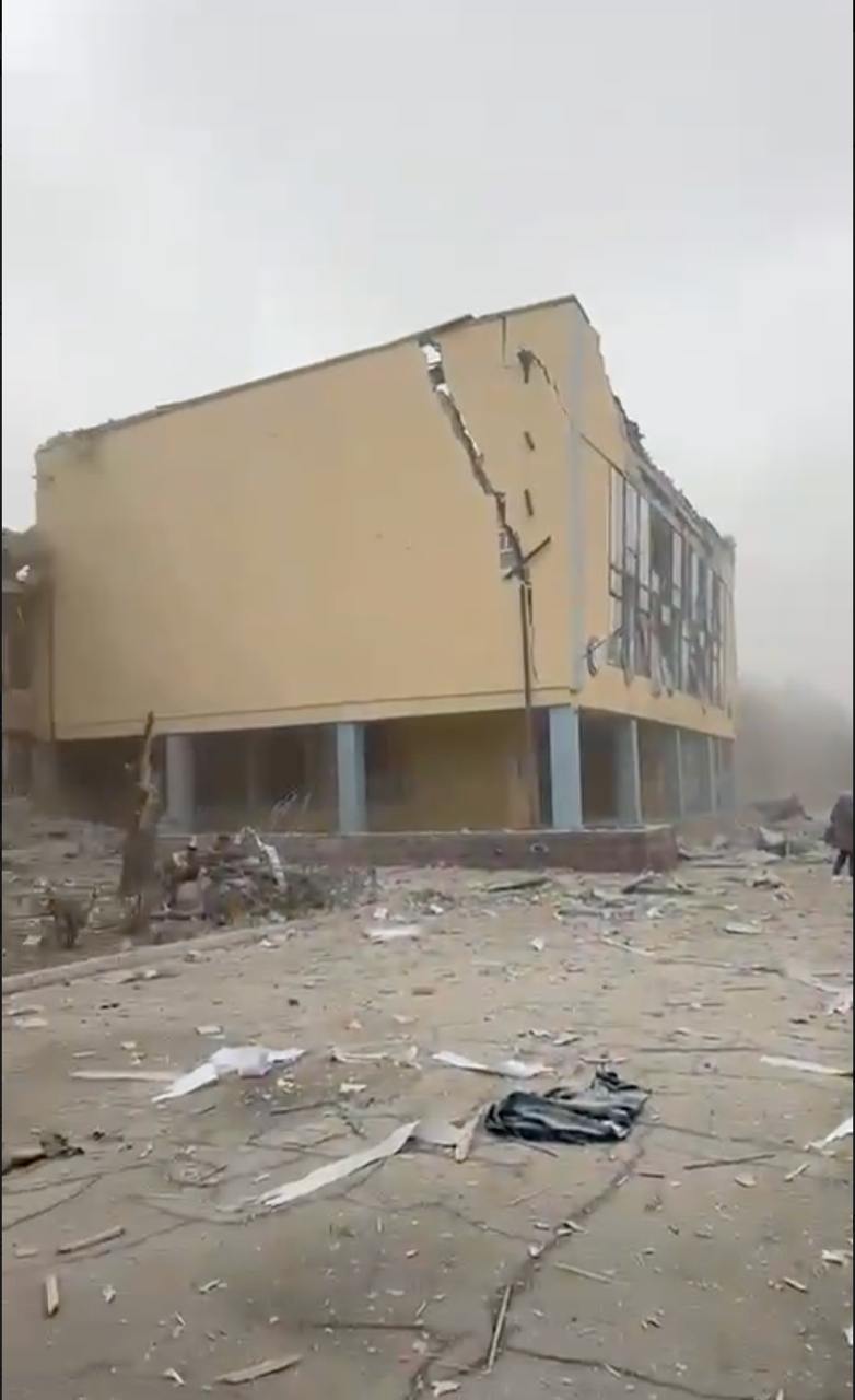В городе повреждены две пятиэтажки. В одной из них возник пожар. Кроме того, изуродовано и не эксплуатировавшееся здание. Судя по видеокадрам, это колледж Национального авиационного университета.