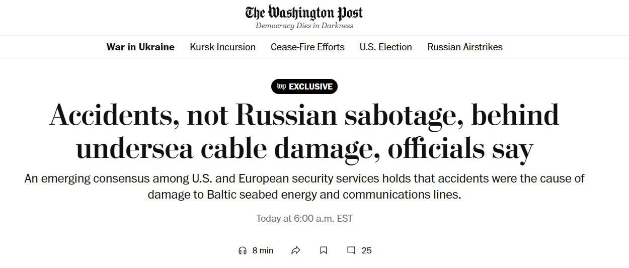 По словам нескольких представителей американских и европейских разведок, разрывы подводных кабелей, скорее всего, были результатом морских аварий, а не российского саботажа.
