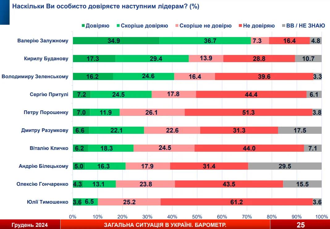 Также президента обходит по рейтингу доверия глава военной разведки Кирилл Буданов, у которого общий показатель составляет 46,7%.