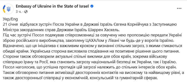 Отметим, что на сайте израильского МИД сообщение об этой встрече отсутствует. Официально Израиль готовности о передаче оружия не подтверждал.