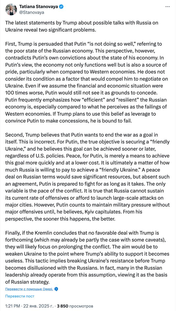 "Во-первых, Трамп убежден, что у Путина не все хорошо, имея в виду плохое состояние российской экономики. Однако эта точка зрения противоречит собственным убеждениям Путина о состоянии его экономики. По мнению Путина, экономика не только функционирует хорошо, но и является источником гордости, особенно по сравнению с западными экономиками. Если Трамп планирует использовать это убеждение в качестве рычага, чтобы убедить Путина пойти на уступки, он обречен на неудачу", - пишет Становая.