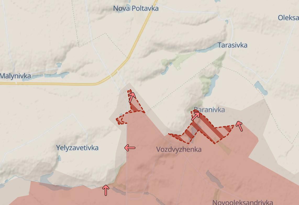 Кроме того, россияне в районе Воздвиженки и Барановки (к востоку от Мирнограда) почти перерезали трассу Покровск-Константиновка - до нее осталось менее километра.