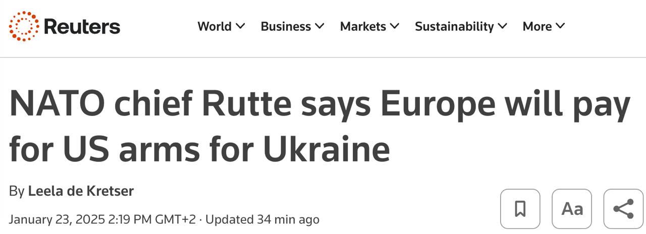 15:02 Европа готова заплатить за американское оружие для Украины, заявил в Давосе генсек НАТО Марк Рютте, призывая Трампа продолжать поставки.