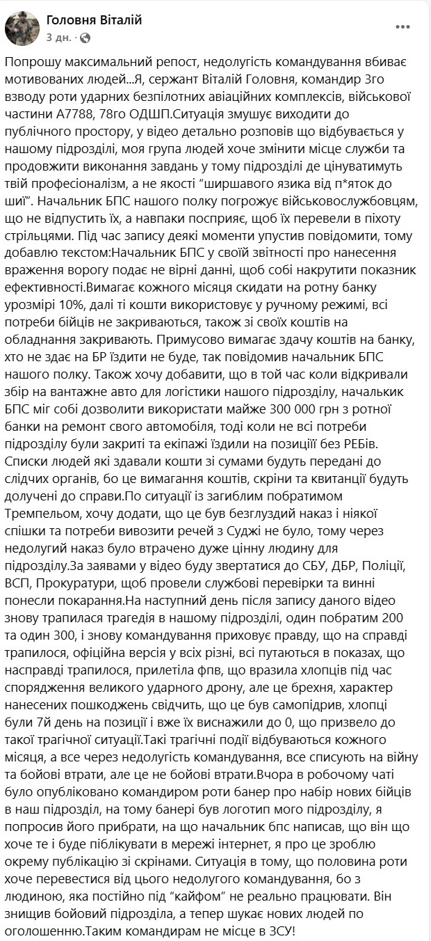 Головня утверждает, что начальник так "за*бал людей", что некоторые самоподрываются во время выполнения задач, находясь по 7 дней на позиции, где их "истощили в 0". Официально заявляется, что этот человек погиб от прилета ФПВ.