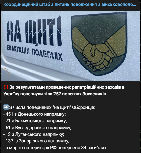 "По результатам проведенных репатриационных мероприятий в Украину вернули тела 757 павших Защитников", - говорится в сообщении.