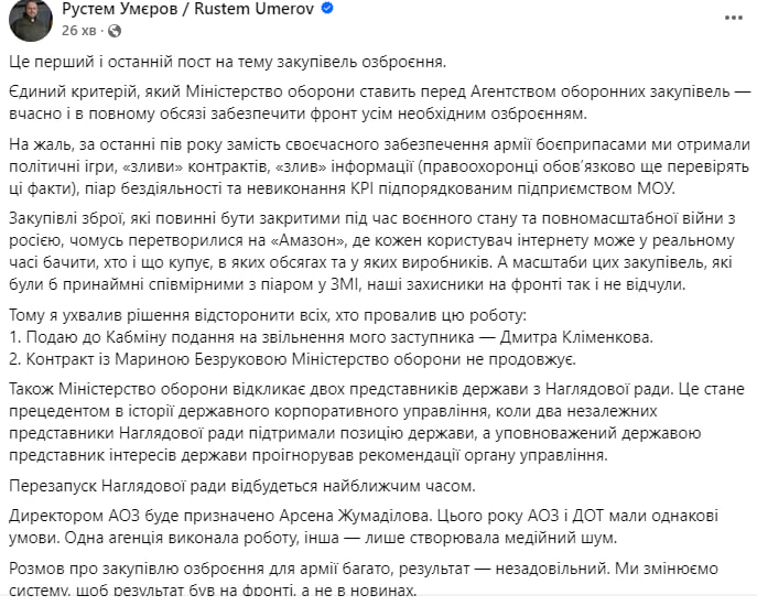 "К сожалению, за последние полгода вместо своевременного обеспечения армии боеприпасами мы получили политические игры, "ливни" контрактов, "слив" информации, пиар бездействия и невыполнение КРИ подчиненным предприятием МОУ. Закупки оружия, которые должны быть закрыты во время военного положения и полномасштабной войны с Россией, почему-то превратились в "Амазон", где каждый пользователь интернета может в реальном времени видеть, кто и что покупает, в каких объемах и у каких производителей. А масштабы этих закупок, которые были бы по крайней мере соразмерны пиару в СМИ, наши защитники на фронте так и не почувствовали", – объяснил Умеров.