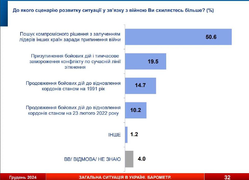 В декабре прошлого года 50,6% опрошенных заявили, что выступают за "поиск компромиссного решения с привлечением лидеров других стран для прекращения войны". В октябре 2024-го таких респондентов было 49,4%, в сентябре - 40,4%, а в феврале - 36,1%.