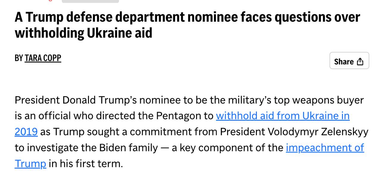 Как пишет агентство, Трамп выдвинул кандидатом на пост главного закупщика оружия в Пентагоне Майкла Даффи – чиновника, который в 2019 году распорядился заморозить военную помощь Украине.
