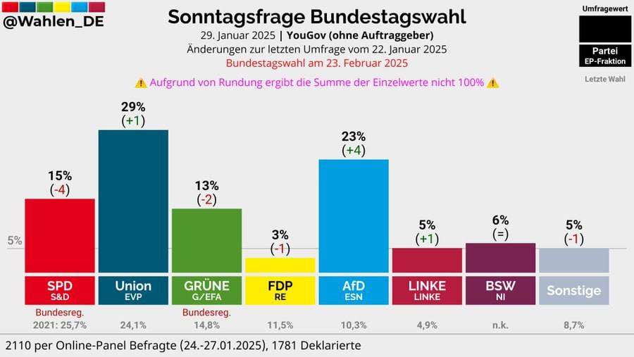 Лидером предвыборной гонки остается альянс ХДС – ХСС, за который готовы голосовать 29% (+1%).