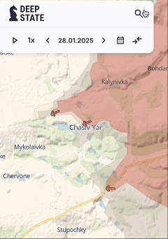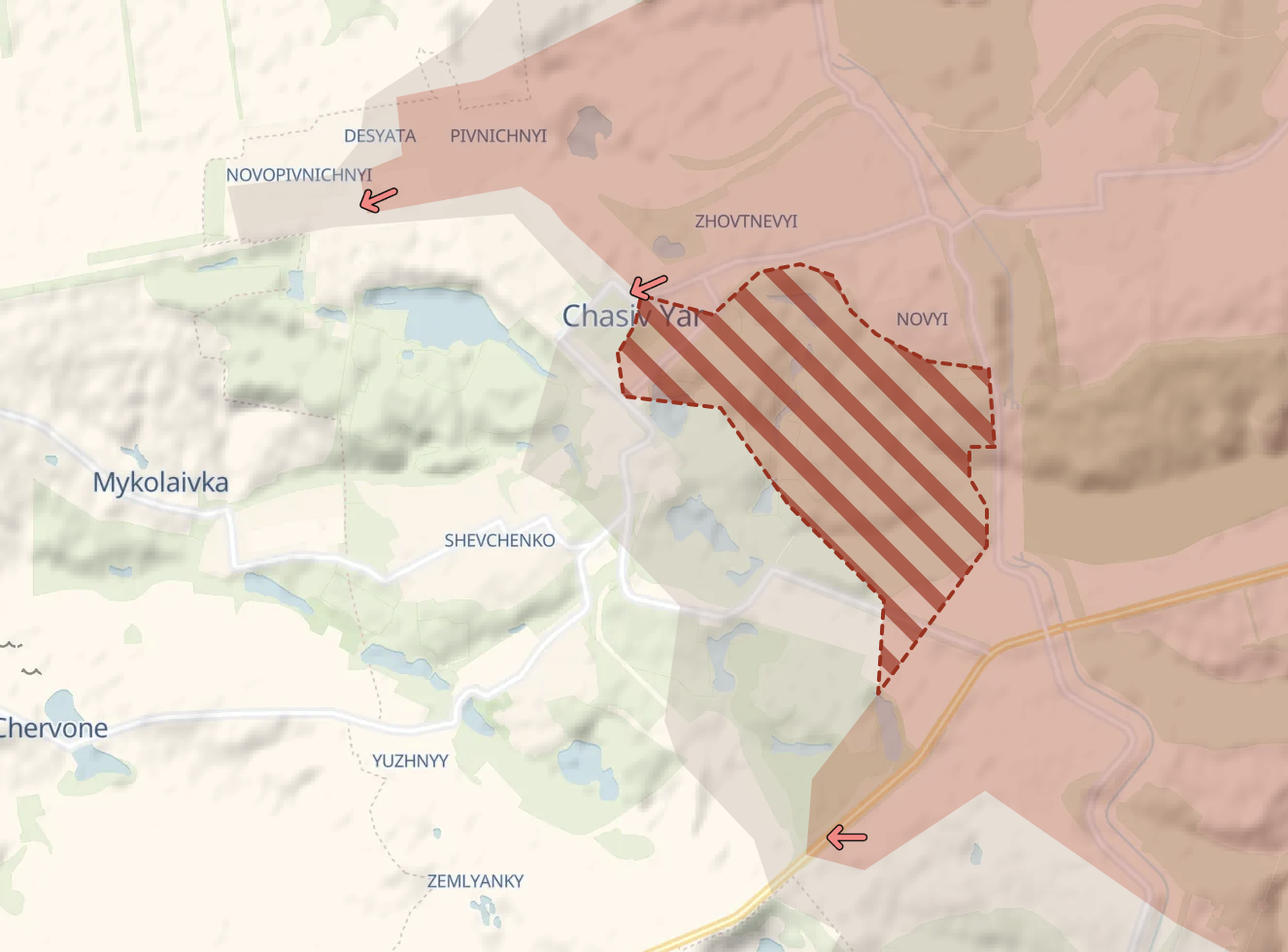 У российских войск крупное продвижение в южной части Часова Яра. Об этом свидетельствует карта украинского военного паблика Deep State.