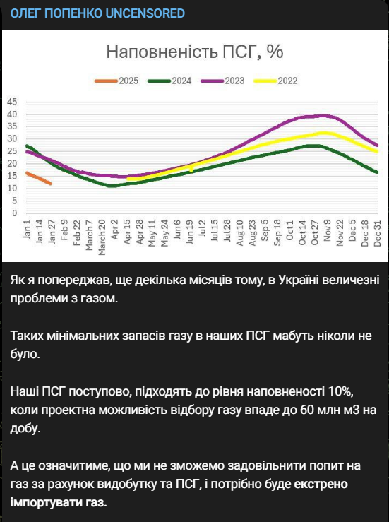 "Таких минимальных запасов газа у наших ПХГ (подземных хранилищах), пожалуй, никогда не было. Наши ПХГ постепенно подходят к уровню наполненности 10%, когда проектная возможность отбора газа упадет до 60 млн м3 в сутки", - написал он.
