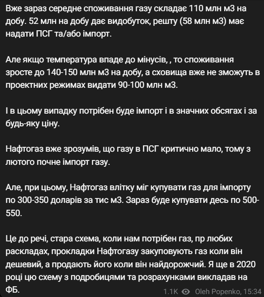 Попенко отметил, что уже сейчас среднее потребление газа составляет 110 млн. м3 в сутки. 52 млн в сутки дает добычу, остальные (58 млн м3) должны предоставить ПХГ и/или импорт.