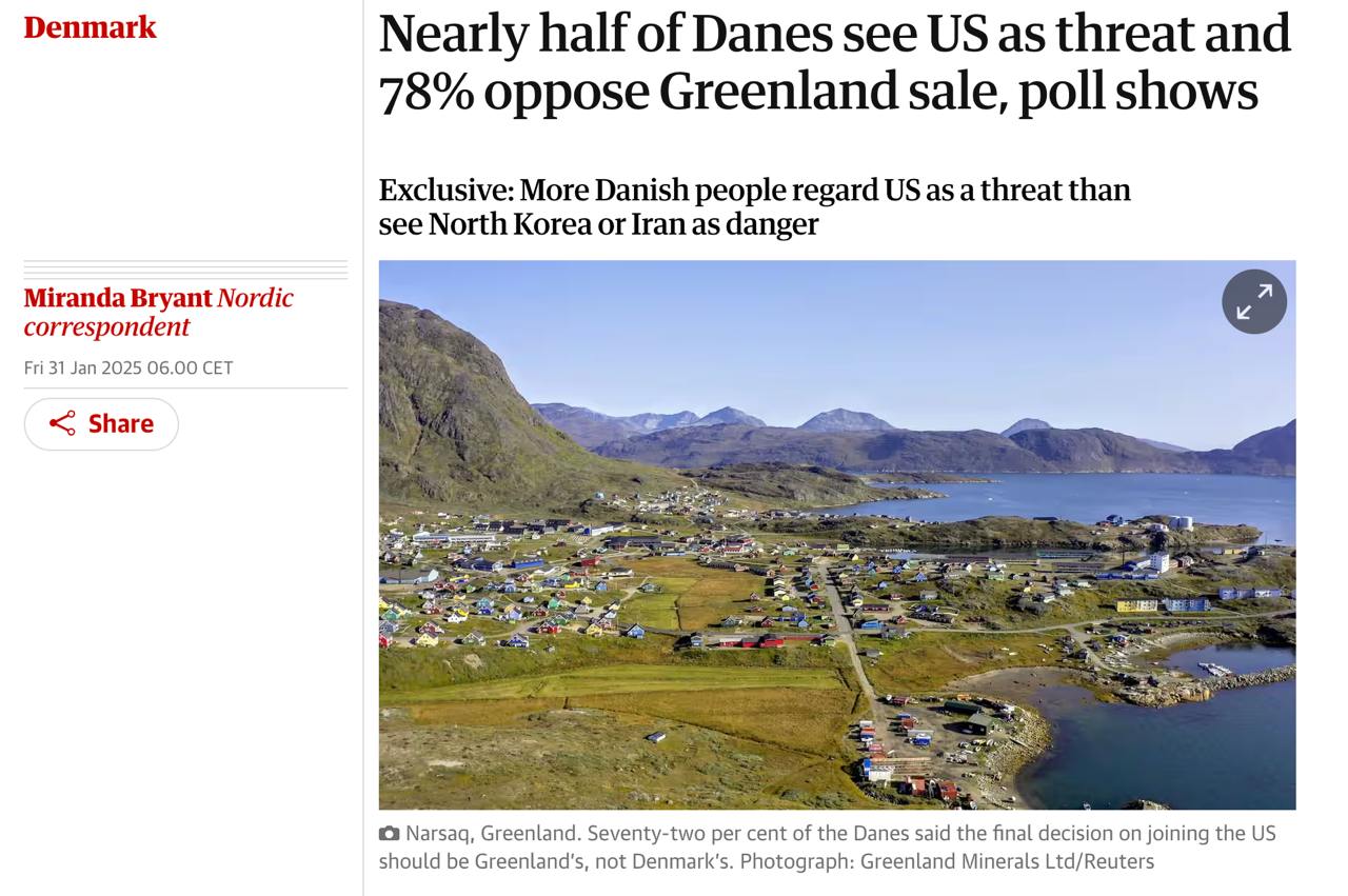 Почти половина датчан считают США значительной угрозой для своей страны, а подавляющее большинство выступает против продажи Гренландии Штатам.