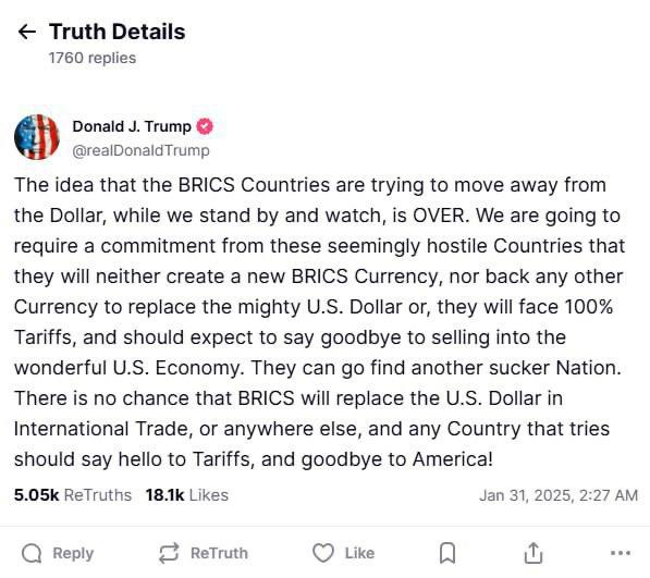 "Идея о том, что страны БРИКС пытаются отказаться от доллара, пока мы просто наблюдаем, закончена. Мы будем требовать от этих, вероятно, враждебных стран обязательств не создавать новую валюту БРИКС и не поддерживать никакую другую валюту, которая могла бы заменить могущественный доллар США. В противном случае их ждут 100% тарифы, и они могут попрощаться с возможностью продавать свои товары в великолепную экономику США. Пусть найдут другую страну-лоха. Нет никакой возможности, что БРИКС заменит доллар в международной торговле или где-либо ещё, и любая страна, которая попытается это сделать, должна готовиться к тарифам и прощаться с Америкой!" - написал президент США..jpeg)
