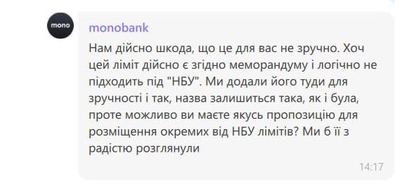 Однако monobank ("Универсалбанк") объяснительных рассылок пока не анонсирует. В службе рассылок клиентов обещают c 1 февраля поместить данные о новых платежных лимитах в раздел "Лимиты НБУ", где содержится информация об ограничениях на другие операции: выдачу наличных со счета, переводы за границу и пр. - хотя новый лимит устанавливает не Нацбанк, а каждый банк по собственной инициативе после подписания вышеупомянутого меморандума.