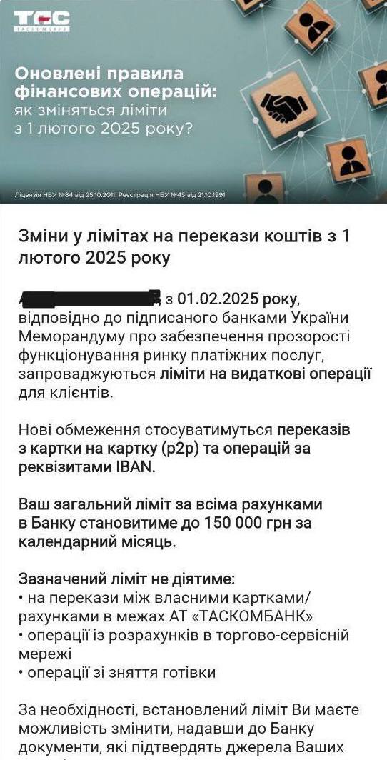 В связи с этим запущены первые клиентские рассылки. В частности, "ТАСкомбанк" информирует клиентов об установленном для них лимите.