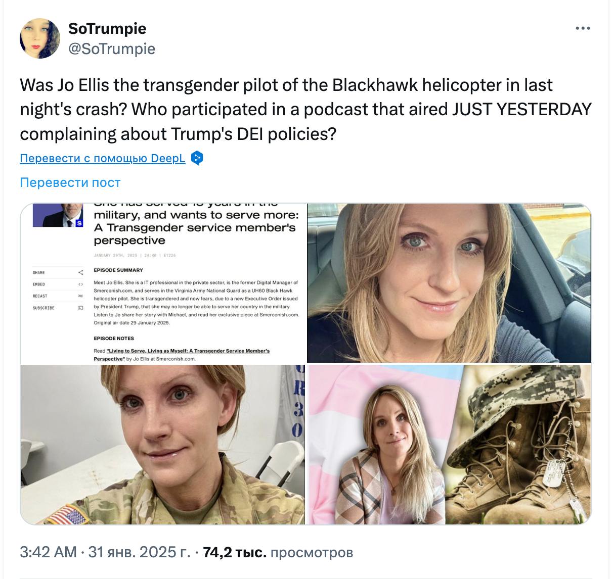 "По слухам, трансгендерная женщина Джо Эллис была пилотом вертолета Black Hawk, который столкнулся в воздухе с самолетом American Airlines. Хотя ее личность привлекла значительное внимание в социальных сетях, информация остается официально неподтвержденной властями", - пишет Santa Monica Observer.