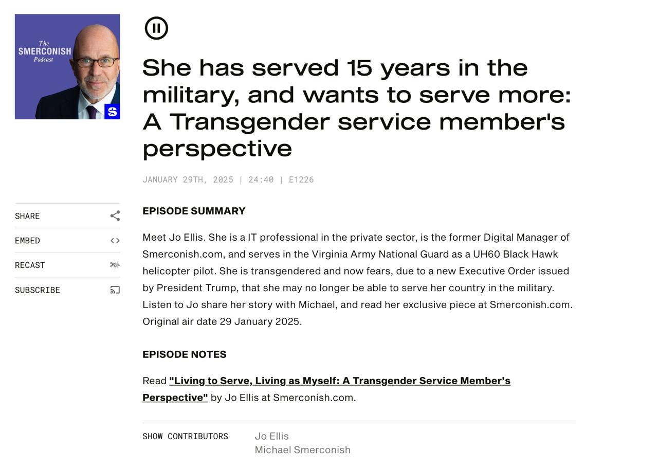 Кроме того, в день авиакатастрофы, 29 января, вышел подкаст с Эллис, в котором она раскритиковала указ Дональда Трампа о запрете служить трансгендерам в армии и заявила, что хочет продолжать службу.