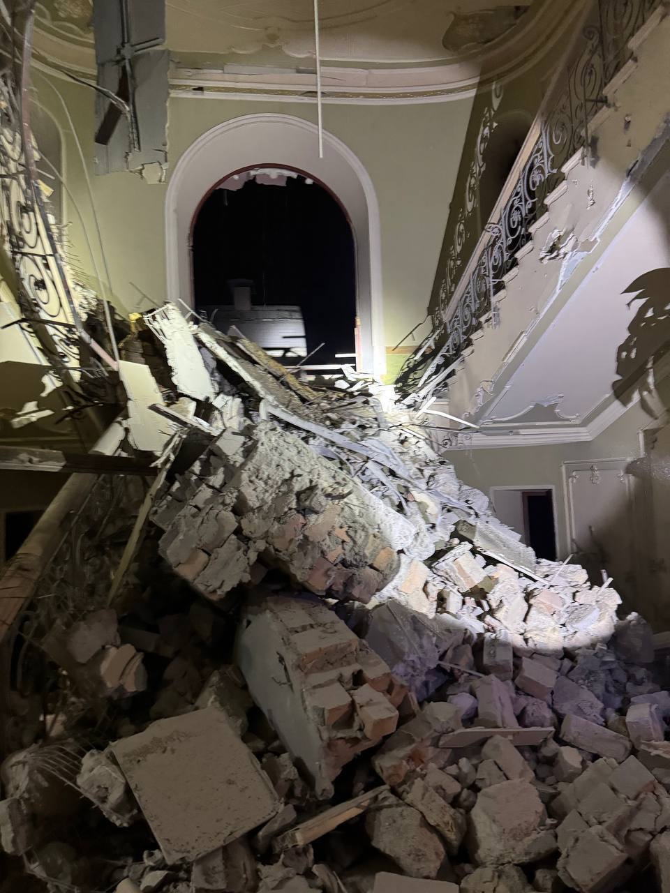 Перед ударом Воздушные силы предупреждали об угрозе пусков баллистических ракет с южного направления. Затем в городе раздались взрывы. Руководитель Одесской областной военной администрации Олег Кипер рассказал, что пострадал исторический центр города. В результате взрывов в помещениях литературного, историко-краеведческого, археологического музеев и музея западного и восточного искусства, а также в филармонии имеются выбитые окна и повреждения фасадов. А мэр Одессы Геннадий Труханов добавил, что большое количество повреждений наблюдается в охранной зоне ЮНЕСКО. В частности, повреждено здание отеля "Бристоль": в нем обрушился потолок, сильные разрушения в помещениях с первого по четвертый этаж.