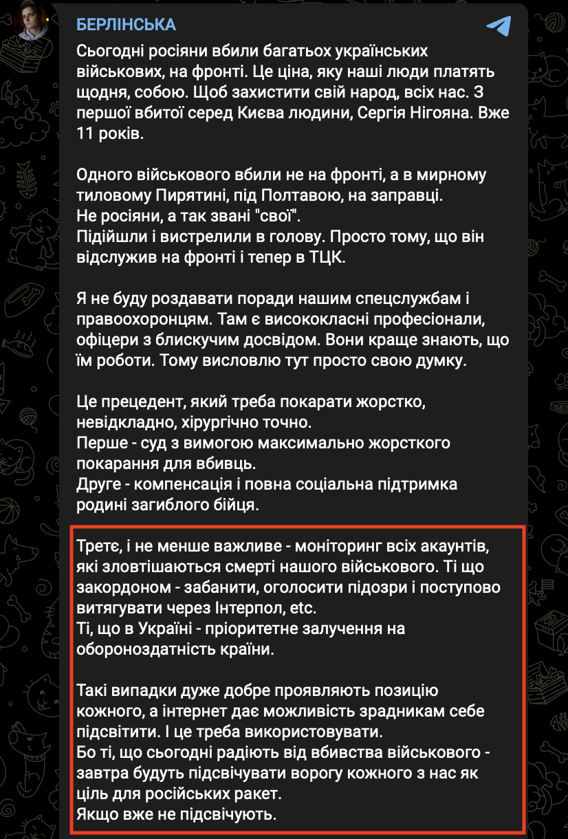 Волонтер Мария Берлинская призвала провести "мониторинг всех аккаунтов, злоупотребляющих на смерти нашего военного. Те что за границей – забанить, объявить подозрения и постепенно вытаскивать через Интерпол, etc. Те, что в Украине – приоритетное привлечение на обороноспособность страны (то есть, мобилизовать - Ред.)".