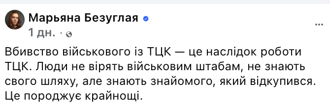 "Кто лично тащил за руку десятки полковников ТЦК брать взятки и отмазывать своих? Забирать людей с оборонных предприятий, зная об их важности? Мобилизовать алкоголиков для отчёта? Кто?" - добавила она. Безуглая уточнила, что не оправдывает убийство, а спорит с теми, кто безоговорочно защищает сотрудников военкоматов.