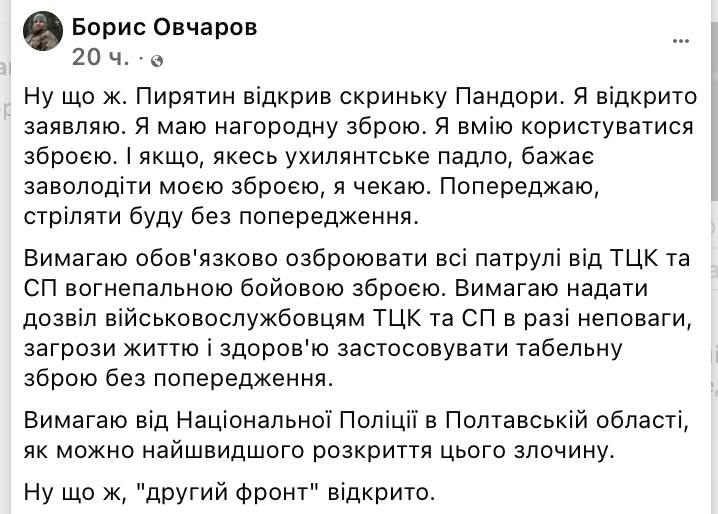"Пирятин открыл ящик Пандоры. Я открыто заявляю. У меня есть наградное оружие. Я умею пользоваться оружием. И если какая-то уклонистская падаль желает завладеть моим оружием, я жду. Предупреждаю, буду стрелять без предупреждения.