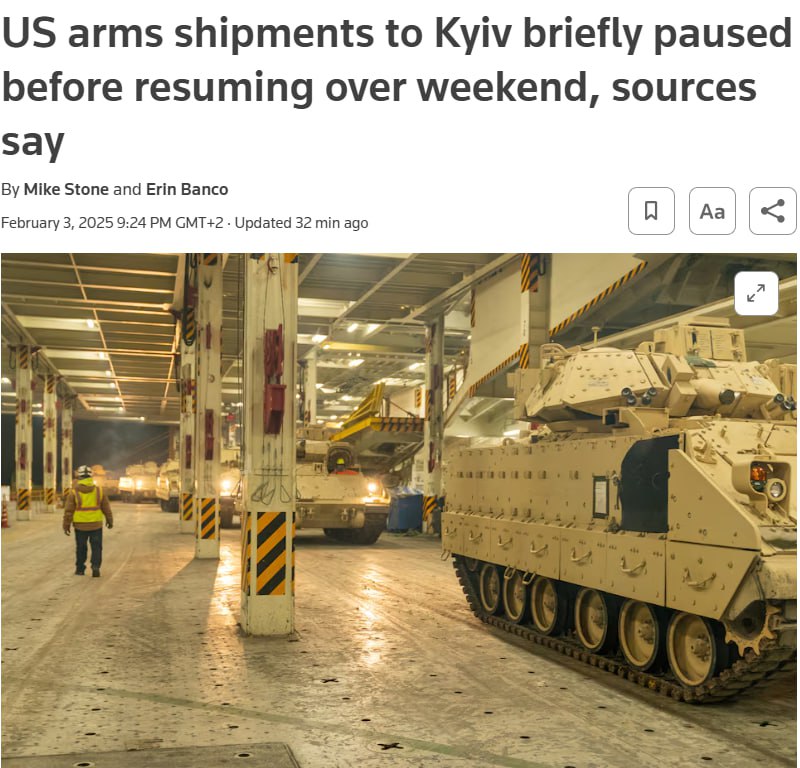 Поставки оружия из США в Украину были приостановлены в последние дни, так как администрация нового президента Дональда Трампа обсуждала свою дальнейшую политику в отношении Киева, но возобновились на прошедших выходных.