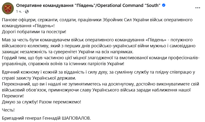 "Имел честь быть командующим войск оперативного командования "Юг" - мощного военного коллектива, который с первых дней российско-украинской войны мужественно и самоотверженно защищает независимость и суверенитет Украины на всех направлениях", - написал Шаповалов.