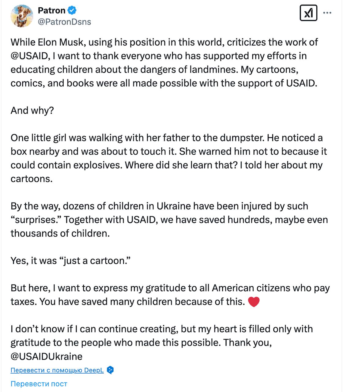 "Пока Илон Маск, пользуясь своим положением в этом мире, критикует работу USAID, я хочу поблагодарить всех, кто поддержал мои усилия по просвещению детей об опасности противопехотных мин. Мои мультфильмы, комиксы и книги стали возможны благодаря поддержке USAID. ...Десятки детей в Украине пострадали от таких "сюрпризов" (мин - Ред.). Вместе с USAID мы спасли сотни, может быть, даже тысячи детей. ...Я хочу выразить свою благодарность всем гражданам Америки, которые платят налоги. Благодаря этому вы спасли многих детей. Не знаю, смогу ли я продолжать творить, но мое сердце наполнено только благодарностью к людям, которые сделали это возможным. Спасибо, USAIDUkraine", - сказано в публикации Патрона.