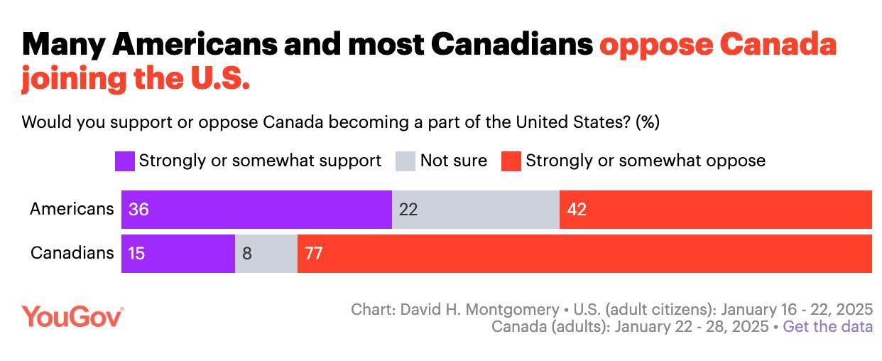 Что касается США, то там треть граждан (36%) поддерживают присоединение к ним Канады, а 42% высказались против этого. 22% не определились с позицией.