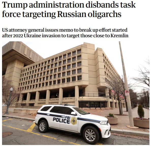 В служебной записке генерального прокурора Пэм Бонди от 5 февраля говорится, что оперативная группа KleptoCapture прекращает деятельность в отношении олигархов в рамках смены фокуса и перенаправления финансирования на борьбу с наркокартелями и международными бандами.