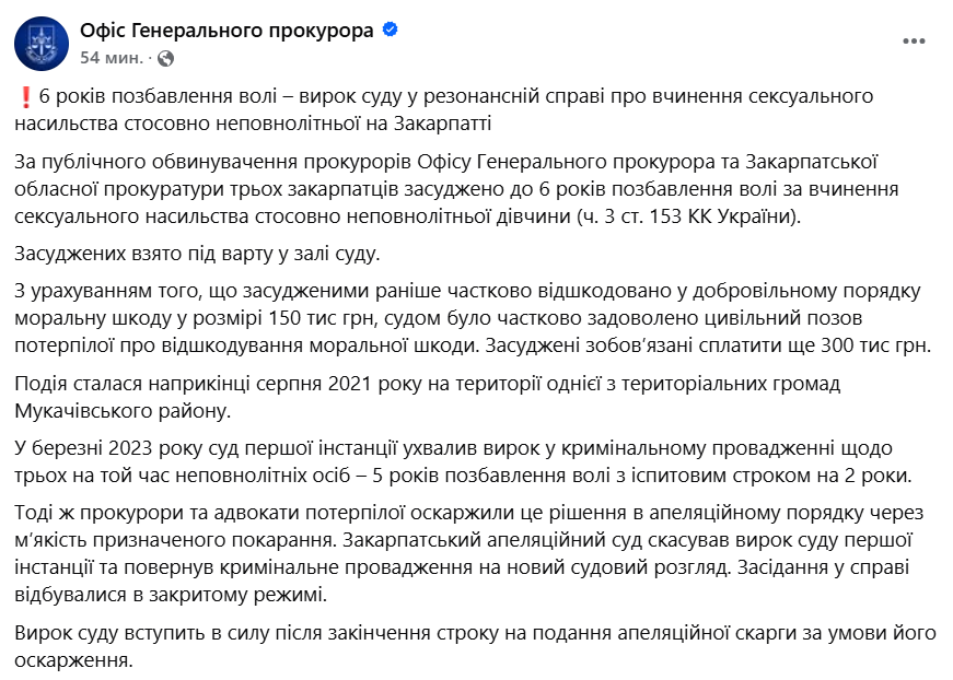 Закарпатский суд приговорил к 6 годам лишения свободы трех обвиняемых по резонансному делу об изнасиловании 14-летней девушки из села Верхние Ворота в 2021 году.
