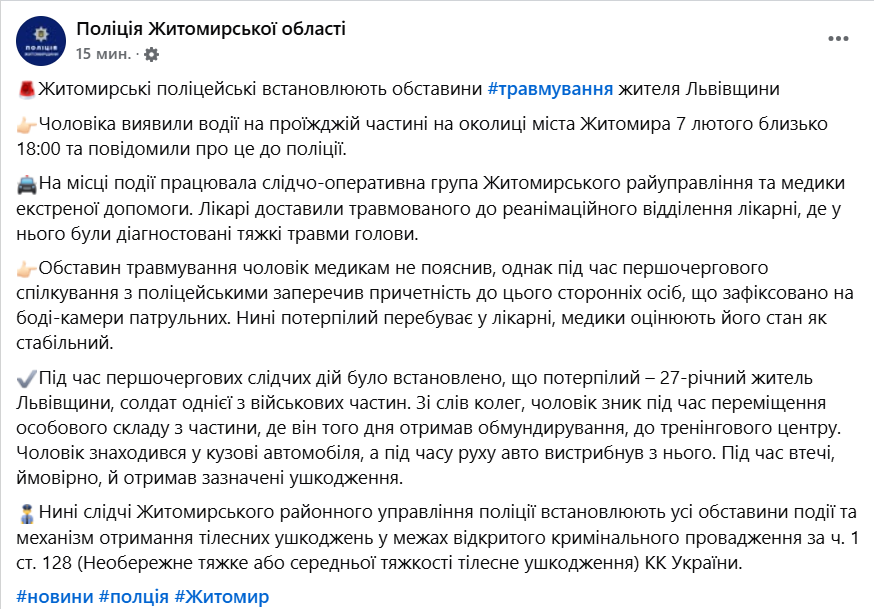В полиции Житомирской области сообщили, что устанавливают обстоятельства избиения львовского преподавателя.