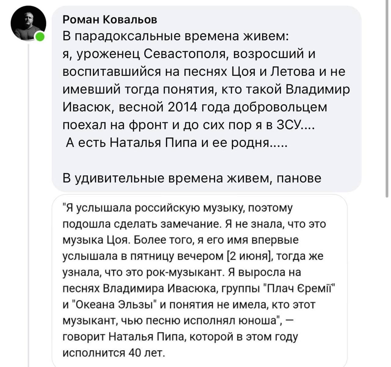 "В парадоксальные времена живем: я, уроженец Севастополя, выросший и воспитавшийся на песнях Цоя и Летова, не имевший тогда понятия, кто такой Владимир Ивасюк, весной 2014 года добровольцем поехал на фронт и до сих пор в ВСУ. А есть Наталья Пипа и ее родня", - написал Ковалев.