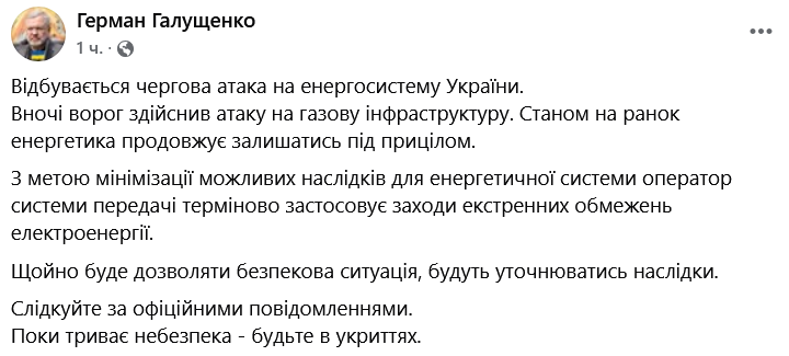 "Происходит очередная атака на энергосистему Украины. Ночью враг совершил атаку на газовую инфраструктуру. По состоянию на утро энергетика продолжает оставаться под прицелом. В целях минимизации возможных последствий для энергетической системы оператор системы передачи срочно применяет меры экстренных ограничений электроэнергии", - написал Галущенко.