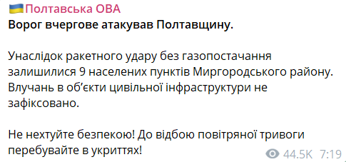 Полтавская ОВА сообщила, что под Миргородом ряд населенных пунктов остался без газоснабжения после ракетной атаки.