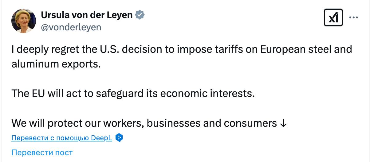 "Я глубоко сожалею о решении США ввести тарифы на европейский экспорт стали и алюминия. ЕС будет действовать в защиту своих экономических интересов. Мы будем защищать наших рабочих, предприятия и потребителей", - написала в Х глава Еврокомиссии Урсула фон дер Ляйен.