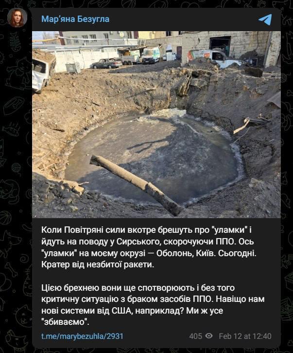 "Когда Воздушные силы в очередной раз врут об "обломках" и идут на поводу у Сырского, сокращая ПВО. Вот "обломки" на моем округе - Оболонь, Киев. Сегодня. Кратер от несбитой ракеты. Этой ложью они еще  больше искажают и без того критическую ситуацию с нехваткой средств ПВО. Зачем нам новые системы от США, например? Мы же все "сбиваем", - пишет нардеп.