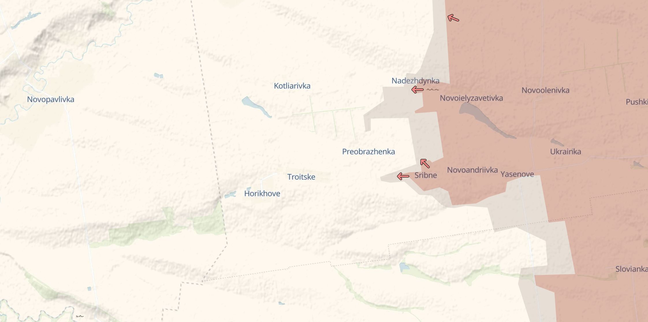 Южнее Покровска россияне стремятся приблизиться к границам Днепропетровской области со стороны сел Срибное и Запорожье, где у них также есть продвижение на запад. Deep State пишет, что на этом участке, вопреки ожиданиям, войска РФ двинулись не южнее, а западнее, к селу Ореховому на границе двух регионов.