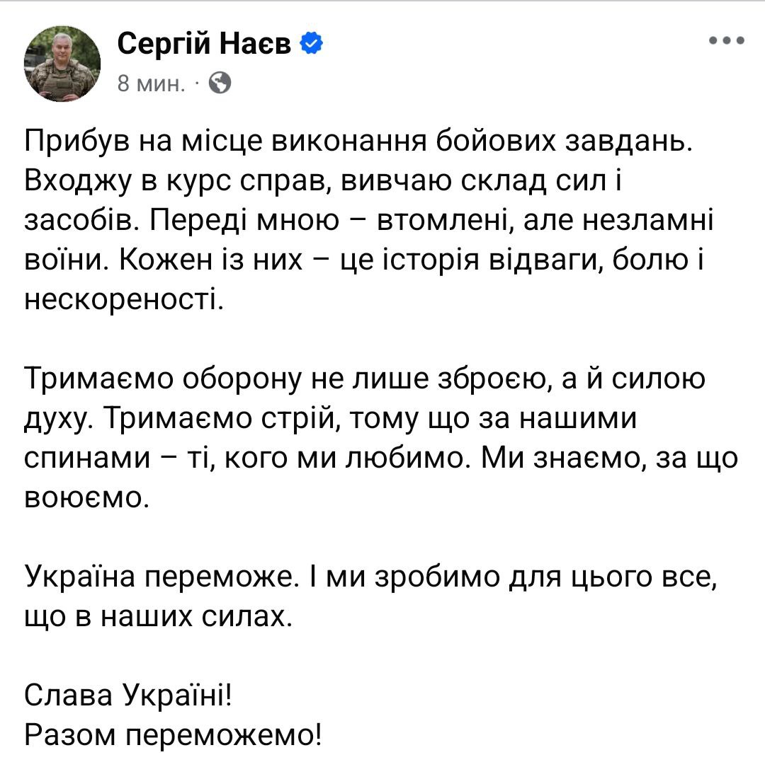 Он опубликовал пост, где заявил, что "прибыл на место выполнения боевых заданий". Дал понять, что войска ВСУ на вверенном ему участке обороняются.
