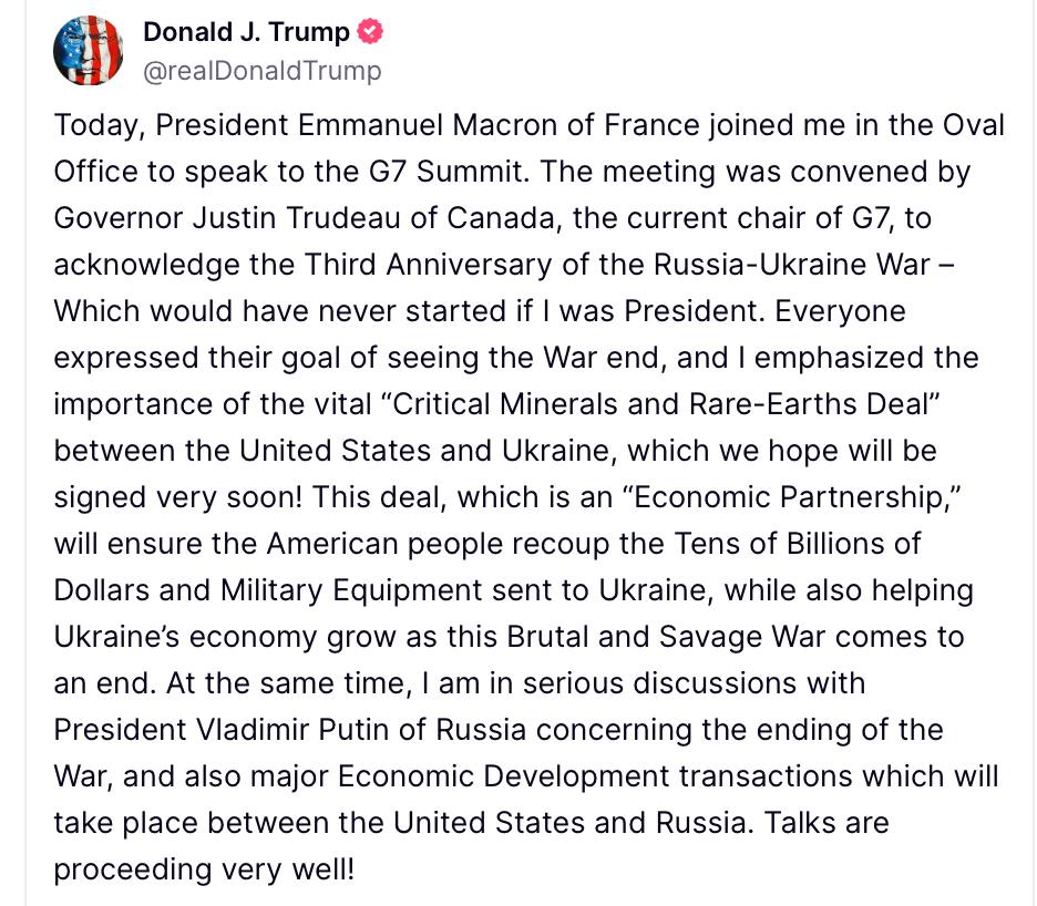 "Я подчеркнул важность жизненно важной "Сделки о критически важных минералах и редкоземельных элементах" между Соединенными Штатами и Украиной, которая, как мы надеемся, будет подписана очень скоро! Эта сделка, которая является "Экономическим партнерством", гарантирует, что американский народ вернет десятки миллиардов долларов и военное оборудование, отправленные в Украину, а также поможет экономике Украины расти, поскольку эта жестокая и дикая война подходит к концу", - написал Трамп в своей соцсети.