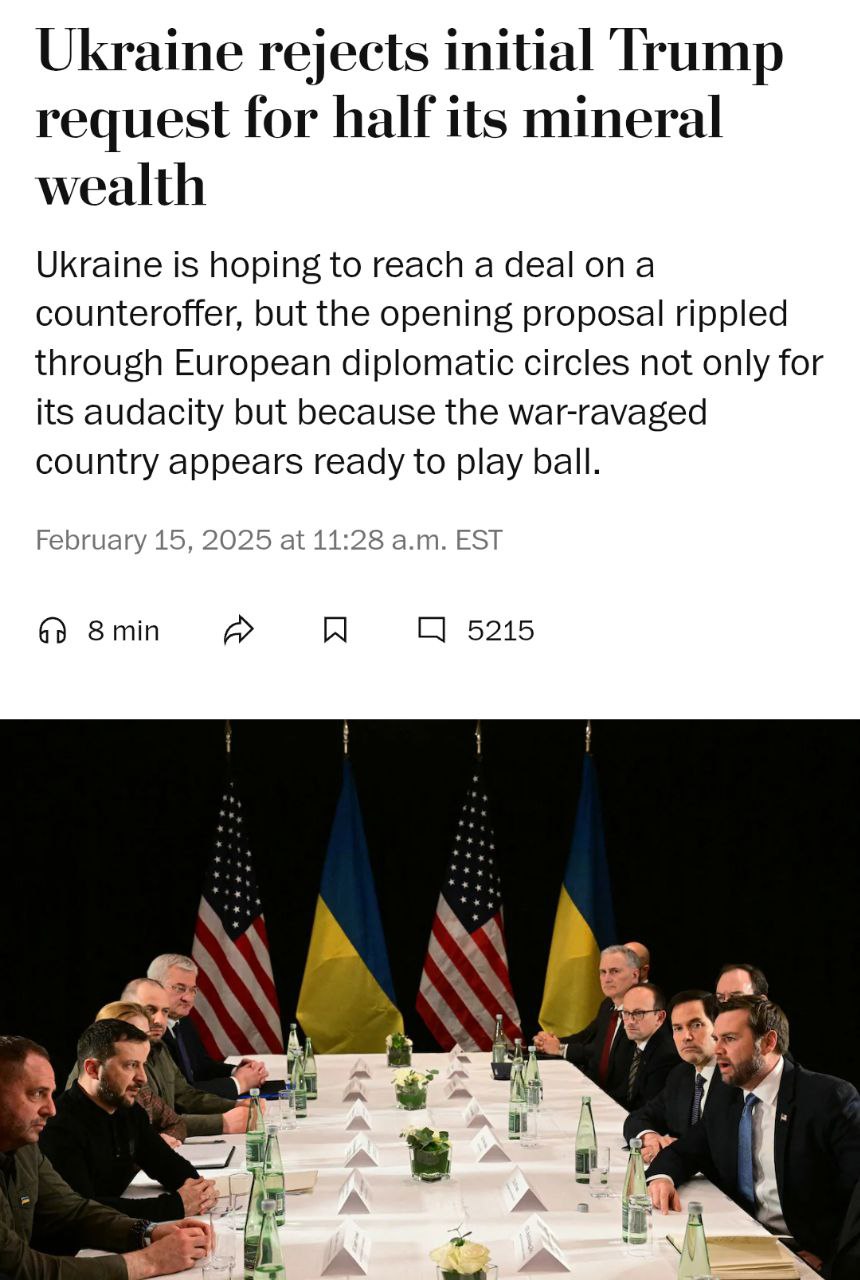 "Высокопоставленный украинский чиновник был ошеломлён масштабом требований администрации Трампа. Он сравнил это с тем, как европейцы делили африканские колонии в XVIII веке, и отметил, что это также может привести к тому, что право на разработку украинских ресурсов будет передано на десятилетия без каких-либо гарантий, что инвесторы действительно займутся их освоением", - пишет газета.